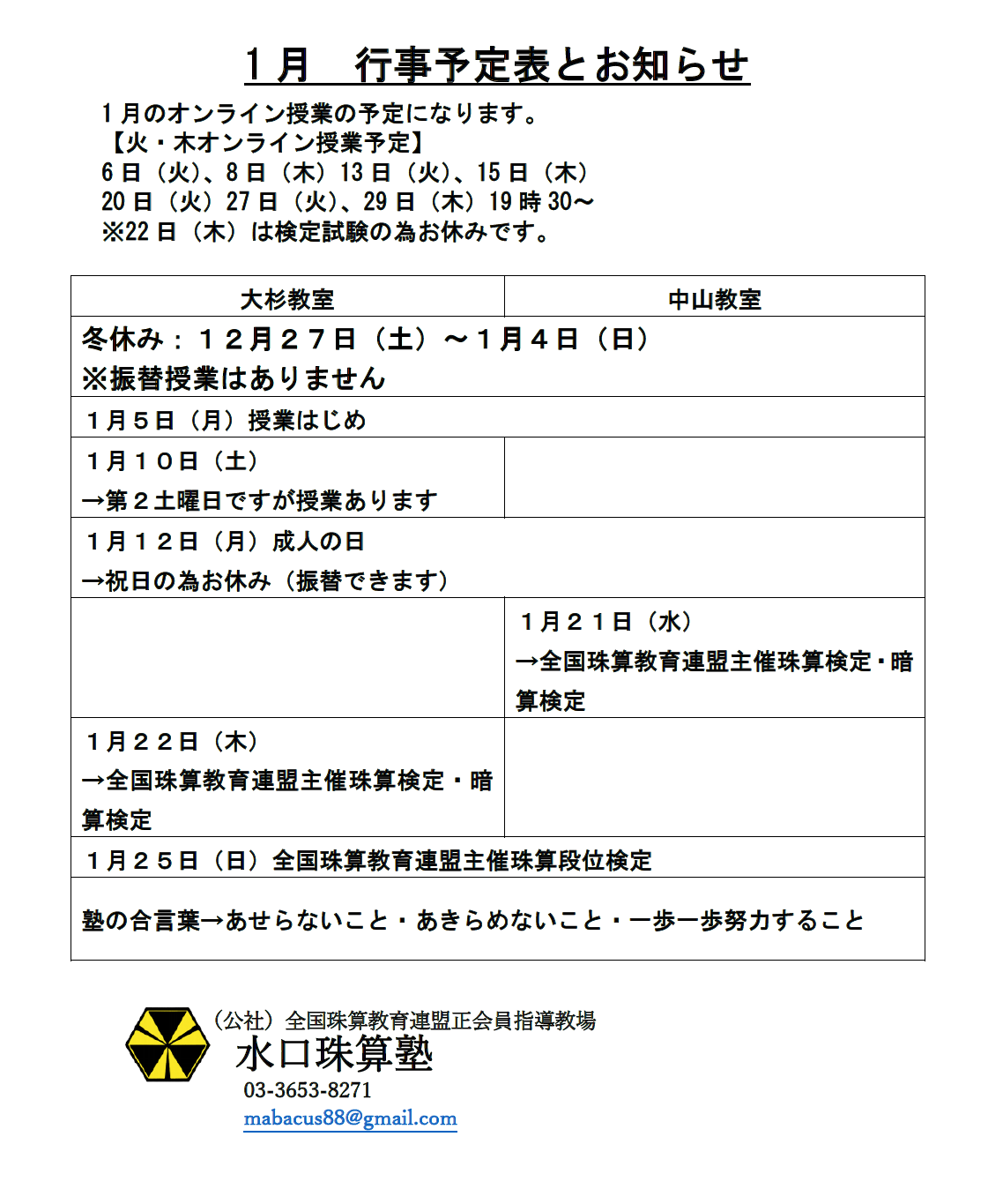 Let’s Try Soroban & Anzan! ー 入学案内は各教室ページへ - 公益社団法人 全国珠算教育連盟 正会員指導教場そろばん無料体験学習受付中!お気軽にお問い合わせください。 問い合わせ先:03-3653-8271 メールアドレス:mabacus88gmail.com 大杉教室 住 所東京都江戸川区大杉5-8-20 最 寄環7と江戸川総合文化センターの間にあります。 中山教室 住 所千葉県船橋市本中山7-4-9 最 寄原木中山駅前にあります。住所的には市川市から通塾の生徒が多いです。