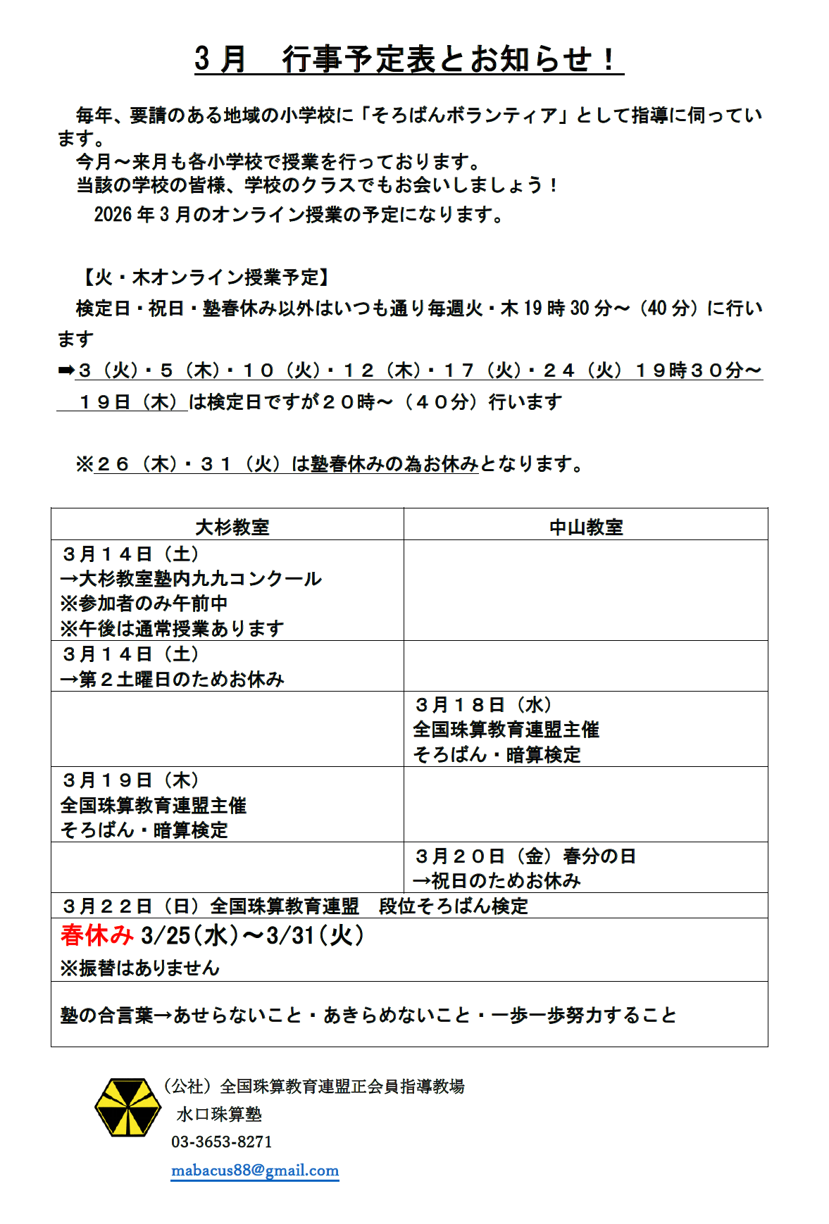 Let’s Try Soroban & Anzan! ー 入学案内は各教室ページへ - 公益社団法人 全国珠算教育連盟 正会員指導教場そろばん無料体験学習受付中!お気軽にお問い合わせください。 問い合わせ先:03-3653-8271 メールアドレス:mabacus88gmail.com 大杉教室 住 所東京都江戸川区大杉5-8-20 最 寄環7と江戸川総合文化センターの間にあります。 中山教室 住 所千葉県船橋市本中山7-4-9 最 寄原木中山駅前にあります。住所的には市川市から通塾の生徒が多いです。